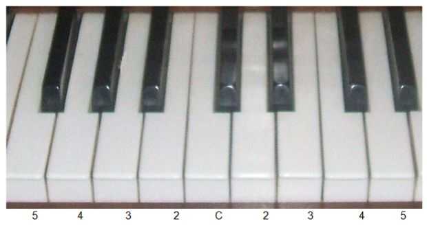El do central, donde pones los dedos pulgares, está marcado con una C. Las teclas con números debajo de ellos son donde pones los dedos. Los dos son para los dedos índice de la izquierda y derecha, los tres son para los dedos del medio, las patas son para los dedos del anillo, y los cincos para tus pequeños dedos.