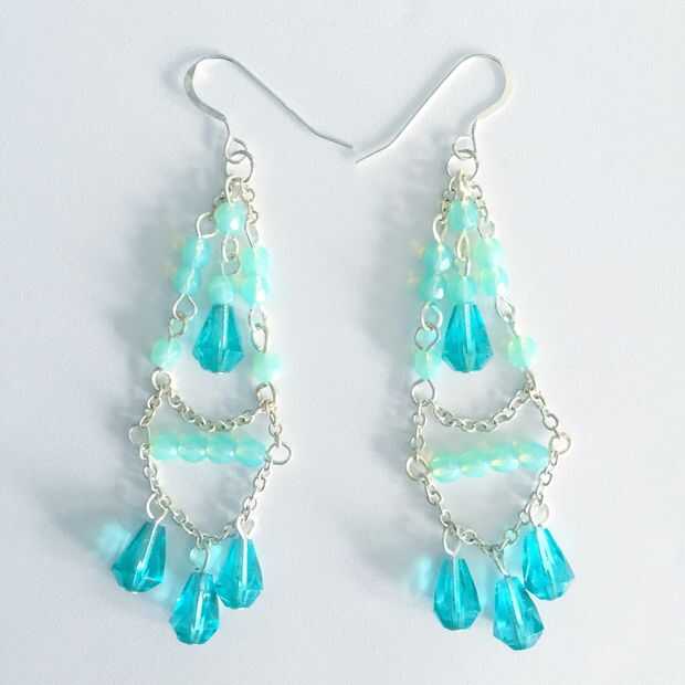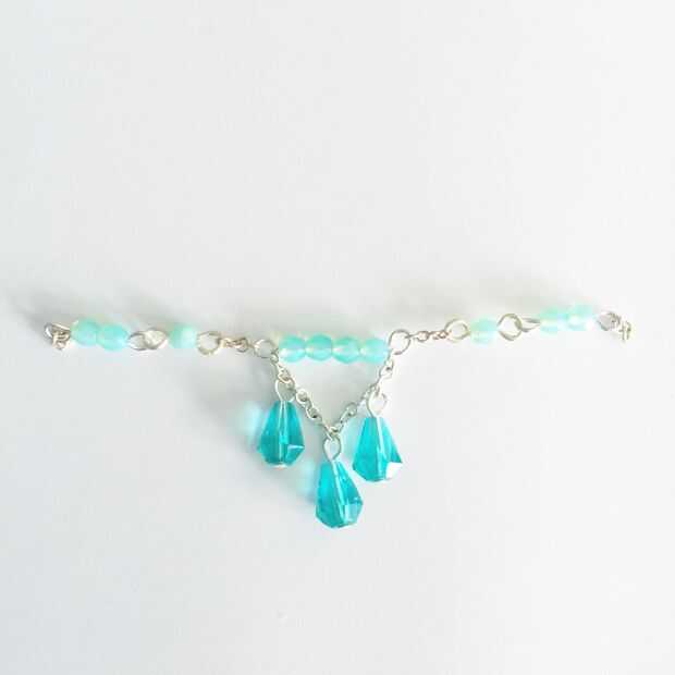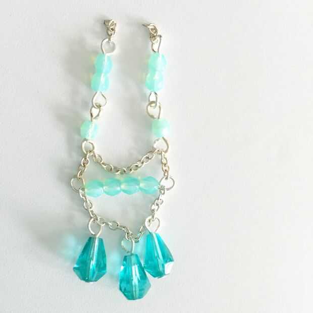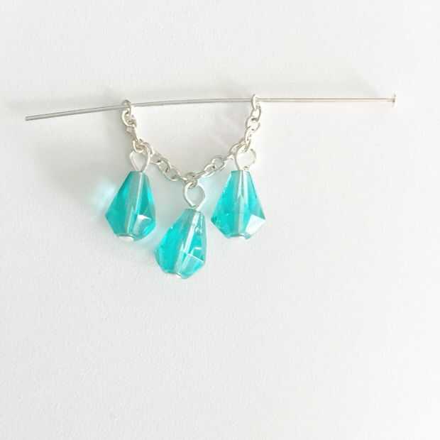 Ahora se ate el pedazo de cadena de 12link en los enlaces de una bola como en la imagen. Última realizará su anillo del salto y abrirlo y poner el lado derecho, luego la gota media, luego el lado derecho. Ciérrelo bien. Fije el cable de oído y has terminado.