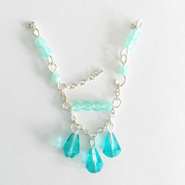 Ahora necesita añadir que su lágrima cae a la cadena de la 21 pieza. Coloque uno a la izquierda en el enlace 5 y uno a la derecha 5 espejo del otro extremo. Luego coloque uno en medio de esos dos. Abre cuatro cuentas y sujete el borde de la cadena de este a cada lado. Antes de cerrar el enlace cuatro cuentas se conecte los otros dos lados a ella. Luego cerrarla. Mirando el cuadro debería ayudar a dar sentido a las indicaciones.