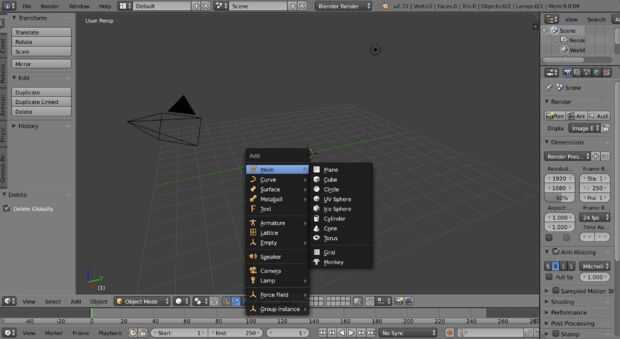 A continuación se que desea poner una forma en la pantalla para comenzar a trabajar con blender. Para ello, desea presione Mayús + A. Aparecerá un cuadro emergente. Allí, tienes que poner el cursor en el menú de malla y elija la forma de lo que usted quiere. Para este tutorial, utilizaré un cubo. (Puede utilizar cualquier forma que desee porque es básicamente el mismo proceso.