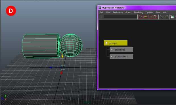 Si lo desea, puede agrupar varios elementos, por lo que se comportan como si fueran una sola entidad. Observar figura (D), en el Hyphergraph, el cilindro y los nodos de ámbito bajo un grupo 'Grupo1' (selecciona tanto los nodos y presione CTRL + G ). Si nos fijamos en los objetos en la vista, tanto los objetos son seleccionados y selección verde y observan que la herramienta de desplazamiento ha cambiado su posición al centro de la red. Ahora si tratas de mover los objetos, ambos se mueven. (Nota: si haces clic accidentalmente en algún otro sitio, simplemente seleccione un objeto que forma parte del grupo y presione la tecla flecha arriba ). Si desea que la herramienta mover en el centro (del grupo), ir a la Modificar > pivote central