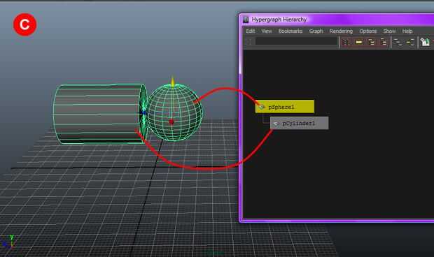 PSphere1 es el nodo padre y PCylinder1 es el nodo secundario (apenas medio del ratón arrastrar y soltar el nodo del cilindro en el nodo de la esfera para hacer la jerarquía), que si muevo la esfera, el cilindro se mueve junto con él. Pero si se mueve el cilindro, la esfera no seguir debido a la jerarquía.