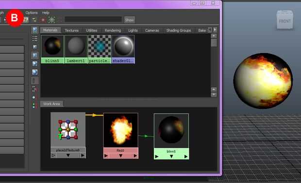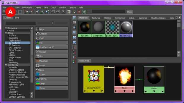 Figura (A) muestra Hypershade en acción, el espacio de trabajo está siendo utilizado para hacer tres conexiones entre nodos diferentes tres, a saber, Place2DTexture | File10 | blinn5,