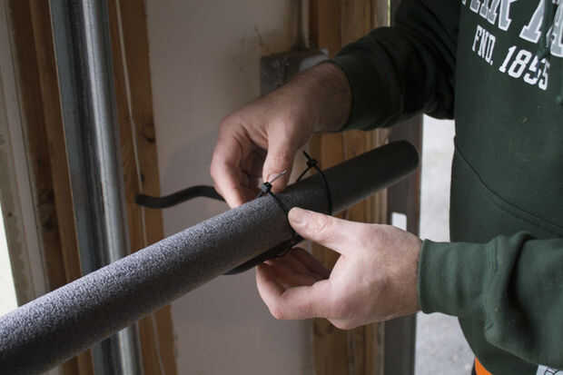 Acoplar con flojedad la aislamiento de la espuma al gancho con dos abrazaderas de plástico. Deberás ajustar el aislamiento, para no tirar lazos de torcedura apretada aún.