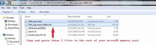 2 extraerlo, abra la carpeta y copie los archivos de la raíz "GBA_Exploader.nds" y "GBA_Exploader.ini" en su tarjeta micro sd.