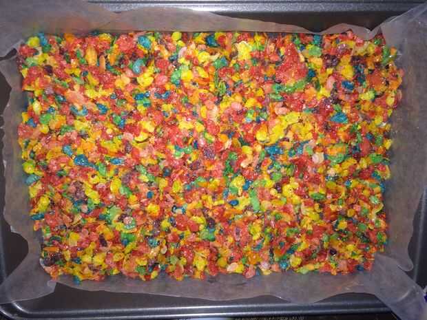 Difundir el cereal encima de la bandeja. Puesto que el pote fue fijado en bajo, no sería demasiado caliente. Por lo tanto, rociar las manos con spray de cocina. Aplane el cereal con las manos.