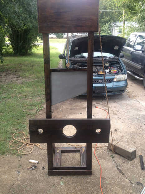 Lo primero es lo primero que tenía que construir la guillotina sí mismo. Era bastante simple. Para empezar tengo 4 piezas de 1 x 3 en una 8' longitud de lowes junto con 2 1 x 2 de la misma longitud y básicamente pegado ellos juntos así que hice dos 8' montantes cada compuestos de 1 x 2 pegado entre 2 de 1 x 3 como se muestra en la imagen. (foto muestra 1 x 4 para los lados pero realmente utilicé 1 x 3 para el prop) Después de ésos eran buenos para ir que lo enmarcado justo arriba en la parte superior e inferior con más 1 x 3 para obtener el ancho que quería. Luego perforé un orificio en la parte superior de la cuerda se deslice a través de la hoja cayó y ató la cuerda a la pala que corté de 1/4 del plexiglás que aerosol pintado de "aluminio" y una pieza atornillada de izquierda más 1 x 2 en la parte delantera y trasera de la hoja en la parte superior para mayor detalle. Entonces llegó el momento de hacerlo a pie. Que se apoya sólo bastante simple. Yo jodidos algunos patas de 2 x 4 saliendo de la parte trasera y en ángulo 2 x 4 de las "patas" hasta cerca de 1 1/2' y fijarse a los montantes. Después de que era robusto y bonito y fue entonces decidí combinar mi guillotina con una instalación de la empalizada sólo por diversión. Sólo usé algunos 2 x 12 y perforados los agujeros de las manos y la cabeza de la corte por la mitad atribuye una bisagra en un extremo y un cierre en el otro por lo que podría abrir y cerrar (no es que necesita demasiado pero yo soy un lechón para la funcionalidad y realismo). Con todo lo que finalmente hace todo lo que quedaba era manchar por lo que parece más viejo.
