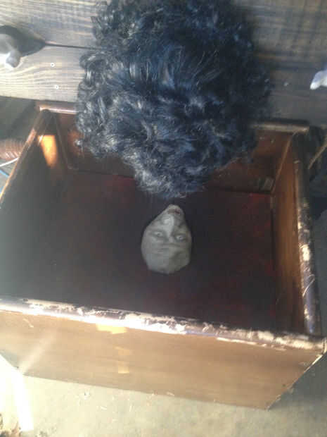 Ahora para el cuadro previsto atrapar la cabeza. Para esto simplemente utilizado planchas de madera que tuve que poner todo para hacer una caja cuadrada nada complicado allí. a ocupar el espacio de que tomó un pedazo delgado plexiglás aerosol había pintado con el material sellador de goma y mientras estaba aún húmeda la empañan con alguna pintura en aerosol rojo dándole un aspecto sangriento piscina después montado dentro de la caja. También tomé la pistola a ella un poco mientras se secaba al crear unos forúnculos en la pintura hace alguna diferencia pero no mucho así que puede no haber sido vale la pena al final sinceramente. Ahora debido a un mecanismo que planeaba usar para reventar la cabeza necesitaba un agujero en el plexiglás así que corte uno solo grande suficiente para pegarse una cabeza rellena en efecto espeluznante luego funcionó la cadena necesitaba a través de él. Lo explicaré en el siguiente paso.