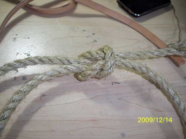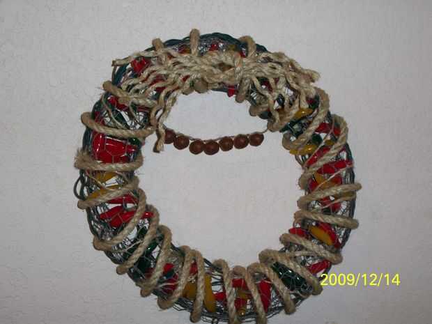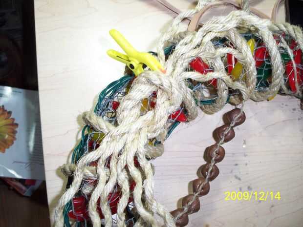 Obtener dos trozos de cuerda y hacer un nudo cuadrado, tratar de estirar las hebras y caliente pegamento el nudo central.  Ah, también he añadido una simple cadena de pequeñas campanas para ir a la corona.