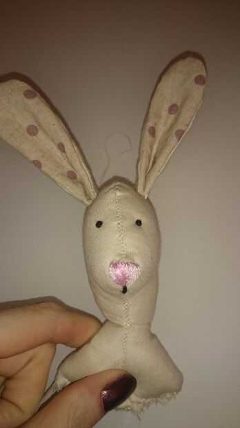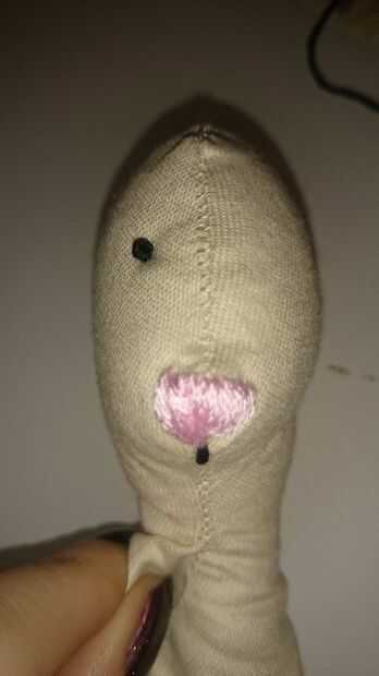 Enrosque la aguja y nudo final del hilo de bordar rosa y la mano puntada forma triangular donde es el punto en la cabeza. Para la boca, use hilo negro y hale la aguja a través de como cerca del punto de la parte inferior de la nariz como sea posible y puntada hacia abajo.