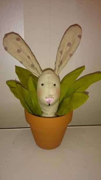 Tirar de algunas de las zonas verdes de los tallos de flores artificiales y pegamento en el interior de la maceta mini, luego pega el conejito en el centro de la olla entre las hojas.