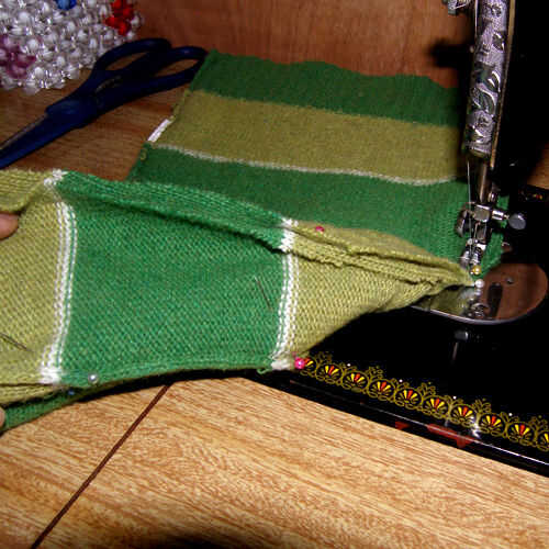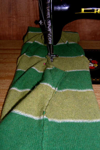 Después de haber cosido las dos piezas a cosen por la mitad dos veces haciendo líneas paralelas con alrededor de 1cm o 1/4 de pulgada entre. Luego cortar entre las líneas paralelas para crear dos tubos. Gírelas hacia el lado derecho hacia fuera.