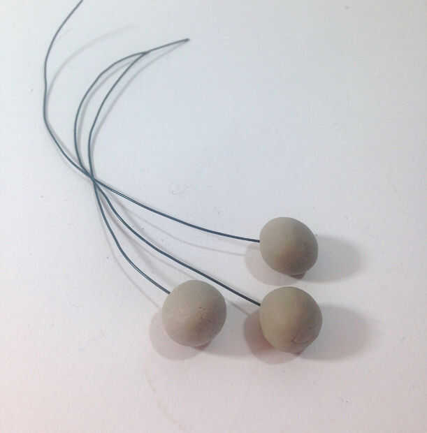 21 (o más) bolas pequeñas de barro para hacer las bayas del rodillo, luego perforar un tramo corto de alambre en cada bola. Deje que seque durante la noche.