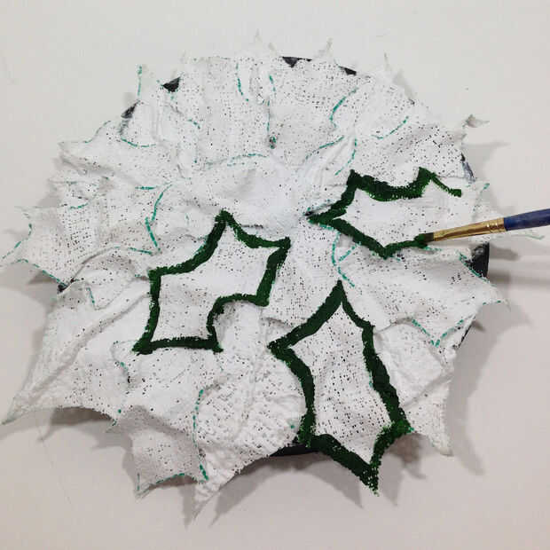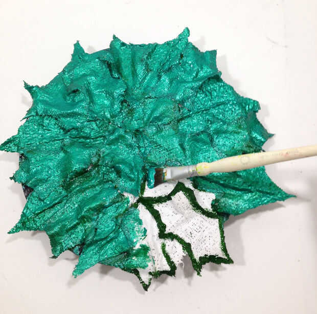 Pintar el resto de las hojas con un verde metálico más ligero. Utilice un pequeño cepillo para obtener color entre todos los espectáculos de yeso de hojas no tan blancas.
