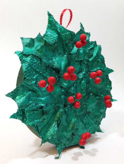 Colocar un lazo de cinta en la parte posterior de la corona con un alfiler para colgar. Fije la cinta contra el disco con un poco de pegamento si se desea.