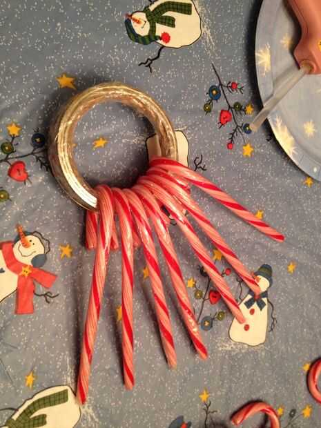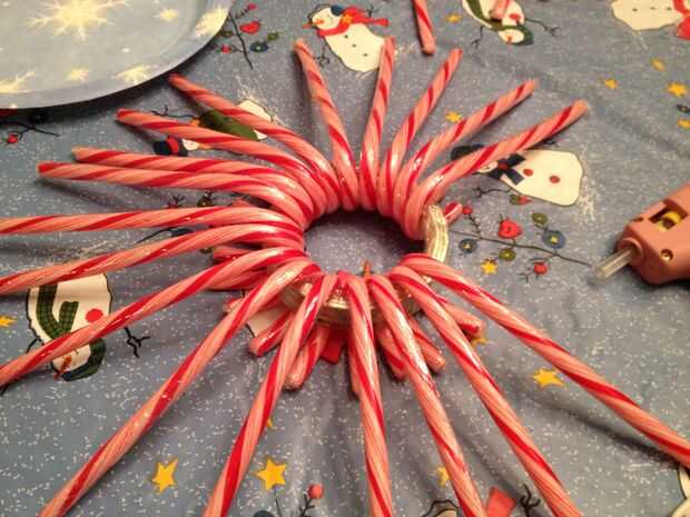Después de establecer una base Asegúrese que la pistola de pegamento caliente se calienta completamente y comenzar pegando un lay de bastones de caramelo alrededor del círculo. Asegúrese de que cada bastón de caramelo sale perpendicular a la tangente del círculo en cada punto. Coloque las latas de caramelo tan juntos como sea posible.