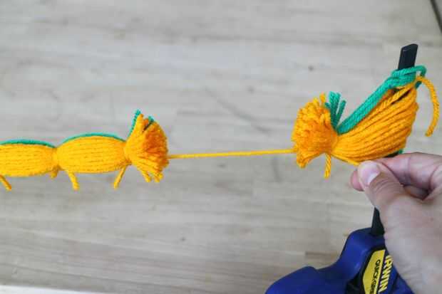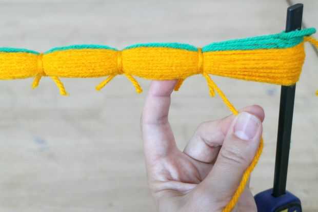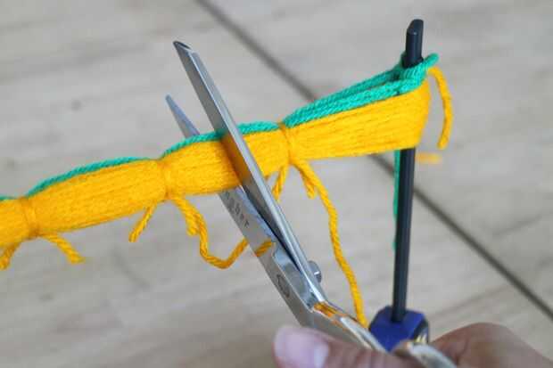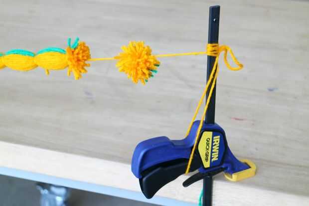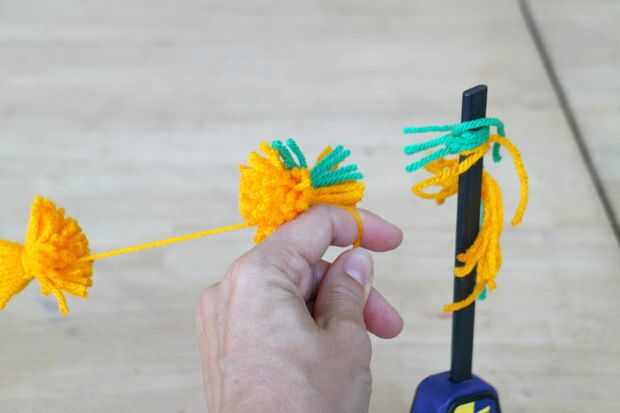Corte el lado externo de la pom pom más cercano a la abrazadera de la misma longitud que el lado interno (aprox. 1") y quitar la desprolija del vertical de la abrazadera. Rehaga el filamento de la guirnalda a la abrazadera.