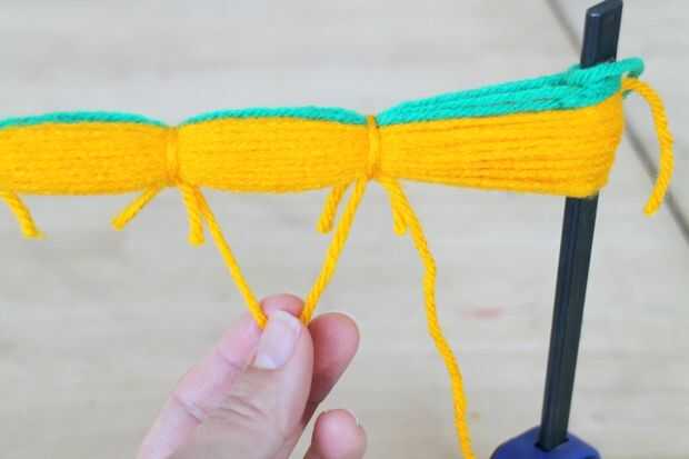 Vas a la cinta de las Naciones Unidas la larga cola que comenzó la envoltura con y cava ese mismo pedazo de hilo hacia fuera de la cima de la envoltura y deshacer la envoltura solo que hizo alrededor del vertical de la abrazadera. Sé que estas fotos me muestran haciendo de la parte inferior, pero como expliqué en el paso 3, las calabazas poco sentarse lado vástago forma más constantemente una vez que los pompones se cortan si el filamento de la guirnalda es justo debajo de la lana de tallo verde Boleros en vez de en la parte inferior. Muestran la forma correcta en el vídeo en el paso 1.