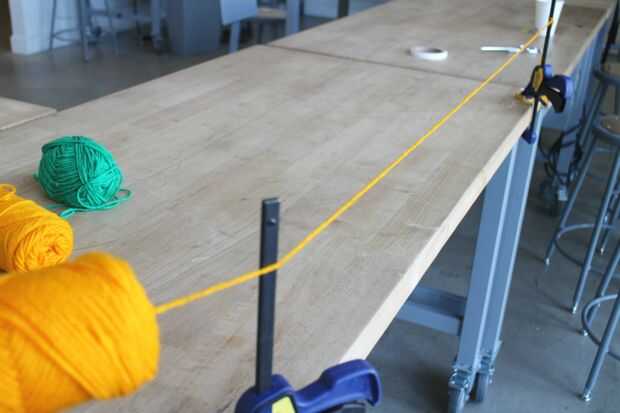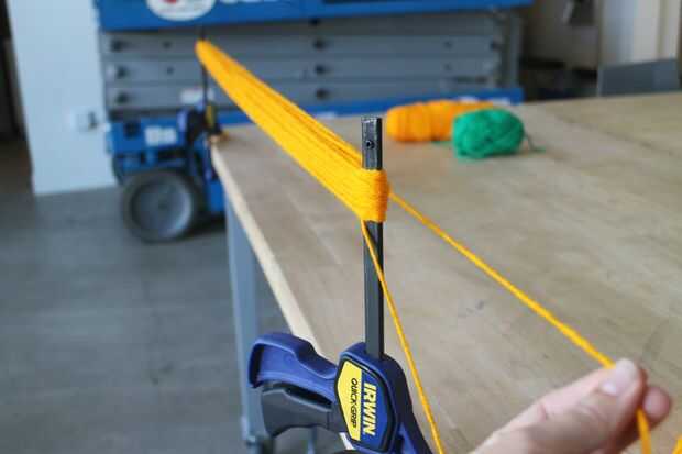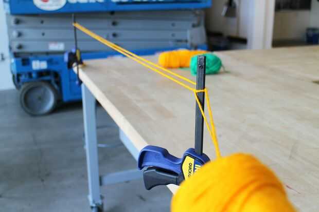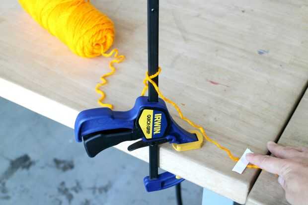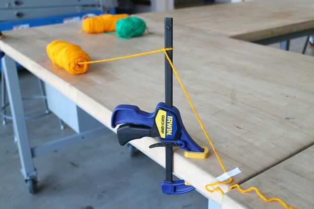 Envuelva el hilo naranja una vez alrededor de uno de los montantes, dejando una cola de 4 pies y cinta el hilo a la tabla.