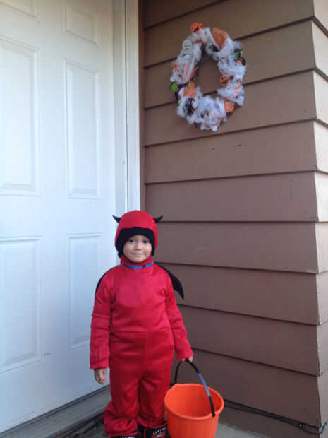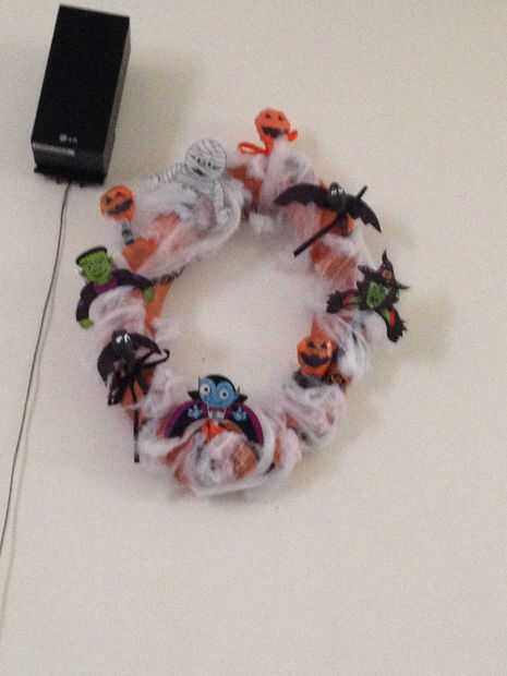 Guirnalda de papel crepe anaranjado, asegurándolo con cinta adhesiva normal o cinta adhesiva lateral doble y lugar Brocheta de golosinas aquí y allá, la cubierta y ajustar los pinchos longitud, cortar si es necesario.