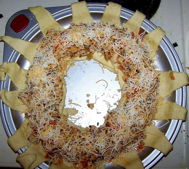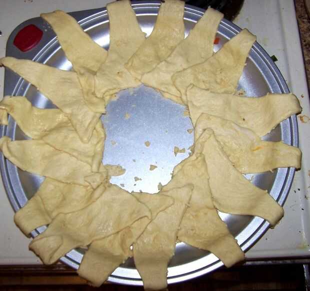 Organizar triángulos, viruta del lado abajo, en círculo en un 13" piedra o pizza de la bandeja para hornear. Ancho extremos deben superponerse en el centro y puntos deben ser hacia el exterior. Debe haber un 5" diámetro de abertura en el centro.