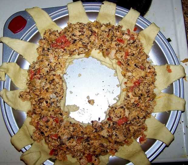 Sacar la mezcla de pollo en los extremos ancho de los triángulos. A continuación, espolvorear con queso rallado más.