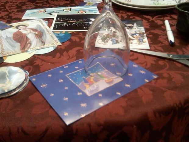 La idea es cortar un montón de formas de círculo de las cartas que son todos el mismo tamaño. No puedo llamar, para rastrear en la parte superior de un vaso de agua o algo redondo del tamaño de una sopa de tamaño medio que puede o jalea frasco. No intentes centrar imágenes en la tarjeta dentro de tu círculo. La imagen va a ser distorsionada por el siguiente paso, así se centran en lugar de un arreglo bonito de color y diseño. Esto también es por qué no utilizar fotografías familiares, aunque si alguien hizo una guirnalda completamente fuera fotos supongo que podría resultar muy bien.