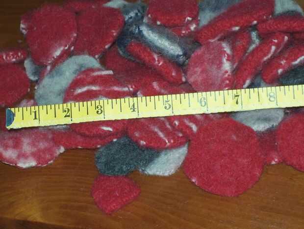 No puedo decir exactamente cuantos necesitas pero pasé cerca de 2 horas de corte mayor de 3 suéteres y terminó con 13 pies de garland. ¿Tal vez cortar hasta que se canse la mano y ver donde estás en el?