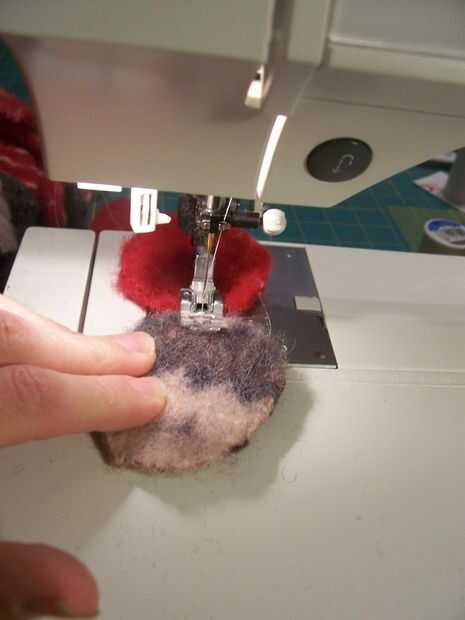 Utilice una aguja de punto de bola y establezca su maquina de coser hacen una puntada larga, recta. También puede utilizar un hilo más pesado (aunque he utilizado hilo de propósito todos y me parece bien). De todos modos, empujar el primer círculo debajo del prensatelas y cosa por el medio.