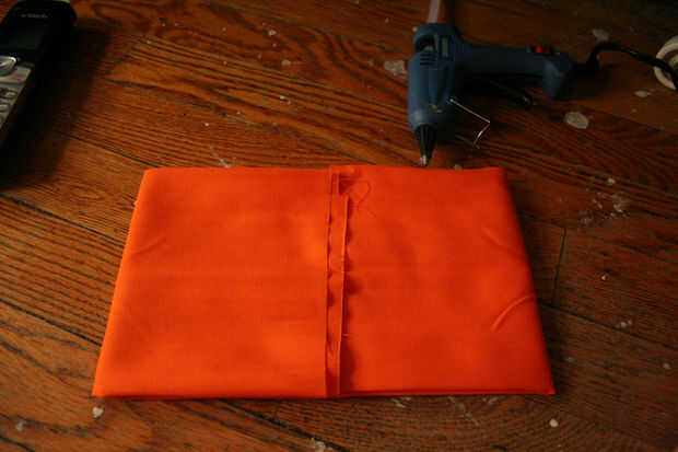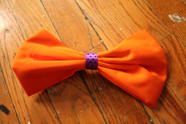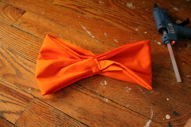 En primer lugar tomar a la tela naranja y colóquela sobre la superficie de trabajo. Doblar a la tela por la mitad dos veces. Luego, doblar los lados de la tela y pegamento caliente en el lugar. Pellizcar el centro para hacer una forma de arco y pegamento caliente en el lugar. Ahora, para añadir un toque especial, puede utilizar alguna cinta púrpura para envolver alrededor de la mitad.