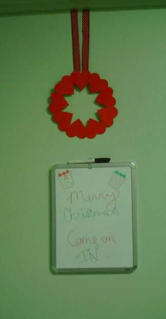 Desde mi antigua casa de campo tiene un raro configurado como estacionamiento en la parte de atrás y entrar en la habitación de lavandería/fango que luego abra en nuestra cocina, colgué mi guirnalda en la puerta que separa los dos espacios. Ahora cuando la familia llega y están quitando sus coates y nieve Botas en el cuarto de lavandería/del fango, son recibidos con esta guirnalda amigable.