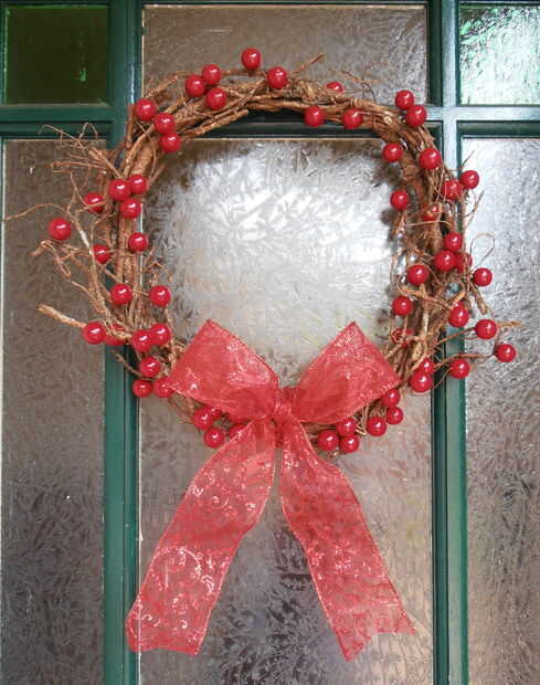 He encontrado una corona de vid confeccionado en un almacén del dólar y un par de paquetes de acebo y bayas. Me la pelaron las bayas, que ya fueron Unidas al alambre de floristería y fijarse al azar a la corona. Por último agregué un enorme lazo rojo y, voila! Easy peasy, se ve muy bien y estaba listo justo a tiempo para el primer día de la Navidad. (2011). probablemente hará una aparición repetir este año en nuestro nuevo lugar.