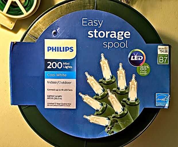 Usé PHILIPS LED Cool White 200 claro Mini luces para esta corona. Este las luces tienen un resplandor blanco brillante. La tecnología LED permite inspira pureza y belleza. Iluminación LED puede ser más eficiente, durable, versátil y más duradero.