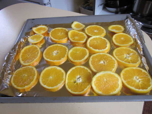 Con el fin de secar las naranjas, cortarlas finamente y colocar entre dos toallas de papel en un plato. Para agilizar el proceso de secado, zapped en mircowave durante 2 minutos para drenar una gran parte de los jugos.