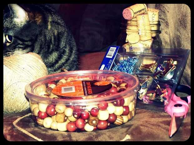 Cáñamo o hilo (y una kitty para masticar mientras intenta tomar una foto de los suministros, gracias Luna)
