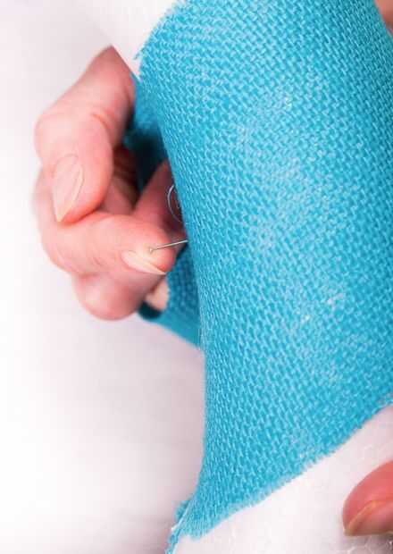 Tome una corona de espuma. Cortar una tira larga del hessian unos 10cm de ancho. Fije un extremo con un alfiler en la espuma. Si la tela no es suficiente, otro corte y continúe alrededor de la corona.