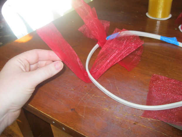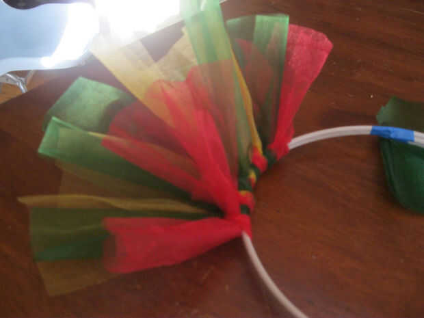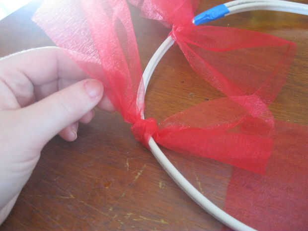 Cortar el tul y lazo en. Corto que sobre un pie de largo, que resultó para ser un poco demasiado largo. Pruebe diferentes longitudes y ver lo que te gusta.