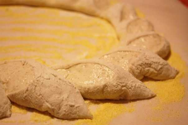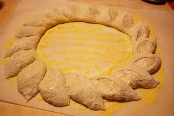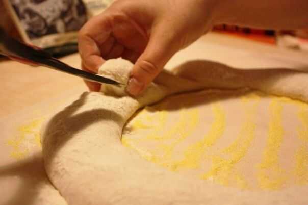 Justo antes de polvo para hornear algunos de harina en la superficie de la masa y, con un par de tijeras, corte de la corona desde arriba, en ángulo, deteniéndose antes de llegar a la parte inferior, luego doblar las piezas para el exterior de la corona.