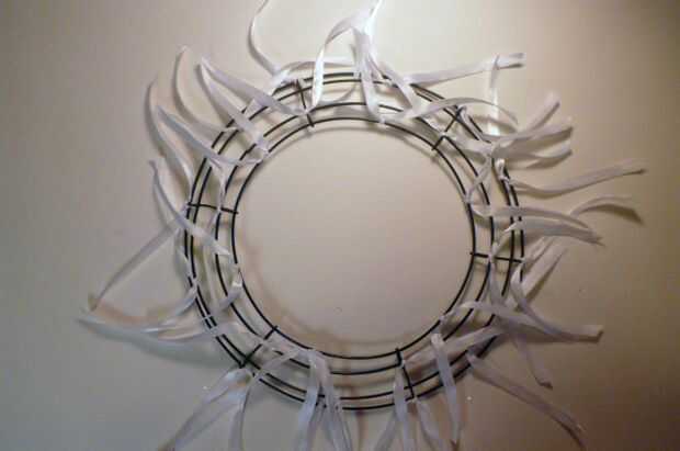 Cortar la cinta de 1/2" en la diagonal 10" secciones. Atar a intervalos alrededor del marco de alambre. Escalonadas las cintas alrededor del marco. Esto creará un efecto de cesta tejida con la malla.
