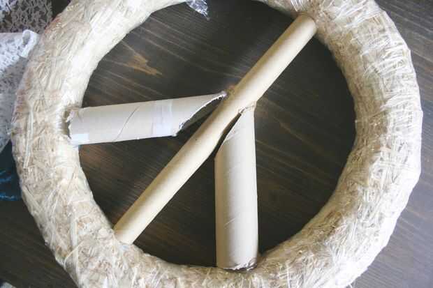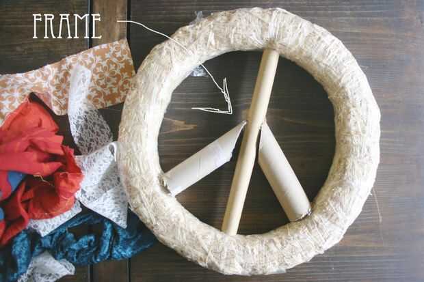 Crear el marco para el signo de la paz con tubos de cartón hueco – toalla de papel, papel de embalaje y papel higiénico es perfectas. Mida y corte un tubo largo para caber dentro del centro de la guirnalda y pegamento caliente en el lugar. Tomar dos rollos más pequeños y medida y corte a la sucursal del centro, cortar en un ángulo para que se ajusten lo más posible y caliente pegamento en su lugar. Todo esto se envuelve en tela – y es perdonar, así que no seas un perfeccionista sobre él.