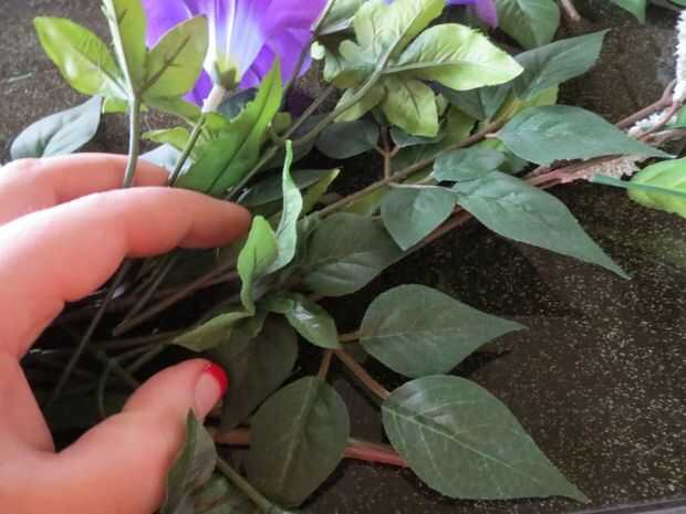 Vamos a empezar con uno grande: tomar una ramita larga frondoso y cruzar el mismo tipo en la parte superior donde la parte inferior de su tallos se entrecruzan. A continuación agregue en una capa de vegetación corta para hacer también que sus tallos fondos cruzan. Luego, añada la bonita flor de relleno que optó por poner tres o cuatro flores en cada lado, manteniendo la colocación simétrica. Otra vez Asegúrese de que sus tallos se cruzan en el centro del haz. Tomar una amarra y unir el centro del haz. Asegúrese de que el empate es seguro y luego cortar el plástico sobrante.