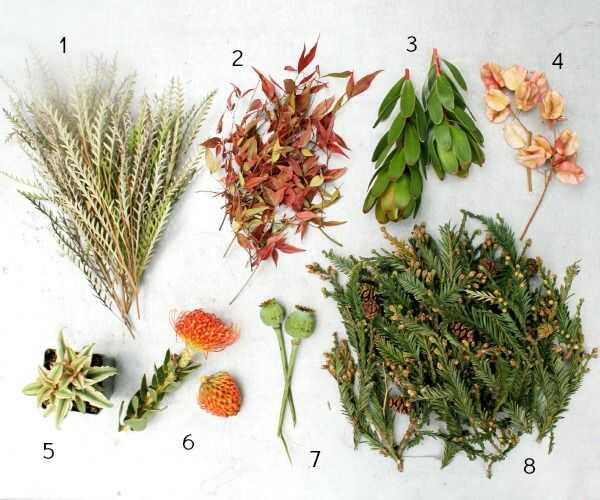 Si tienes problemas para encontrar las de su vivero local o la floristería, elegir cosas que está dibujado a. Sólo asegúrese de que usted tiene una variedad de colores y formas/tamaños - al menos dos diferentes verdes spriggy más bien pequeñas y unos resistentes flor/suculentas/bromelias (algo que va a durar y mantener buena apariencia exterior fuera del agua o se seca).