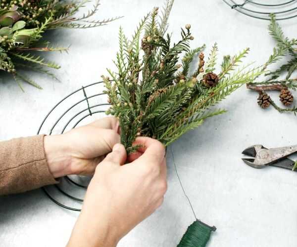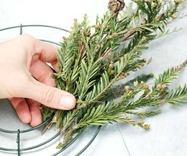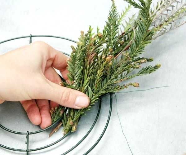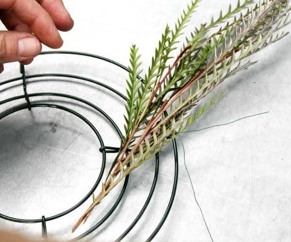 Inicio estableciendo un manojo pequeño de uno de sus verdes, como se muestra en la foto primera de arriba. Agregar unas ramitas más otros verde en la parte superior del primer racimo.