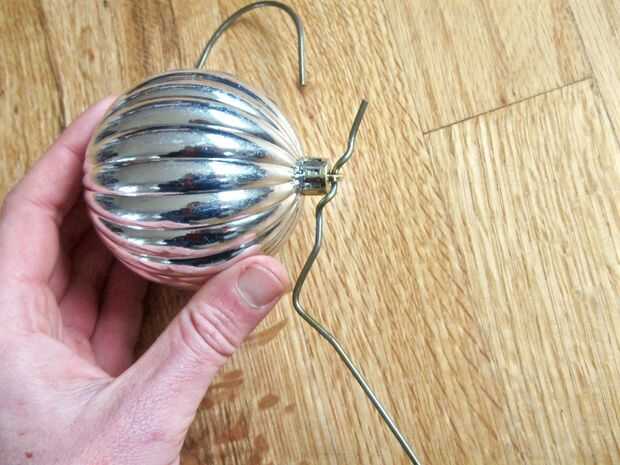 Trabajar suavemente cada uno de sus ornamentos a su suspensión. Dependiendo del tamaño del agujero del gancho en el ornamento, que tenga que hacer girar el ornamento para llegar alrededor de las bobinas restantes en la parte superior de la percha. Ser paciente, se deslizan. Si quieres alternar colores para que su corona tiene un aspecto variado.
