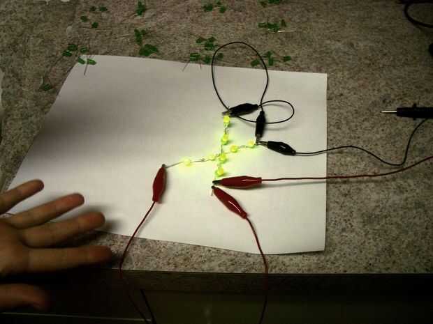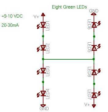 Aquí es un esquema que muestra ocho LEDs verdes, con una línea entre cada par de cuatro, como ya comentamos anteriormente. Cuenta que hay un más y un menos en cada par. Todo lo que tenemos que hacer es conectar ambos de los pros y los contras para completar el circuito y hacer todos los ocho LEDs brillan.