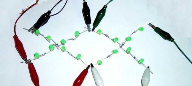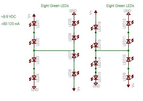 Tomar x LEDs y uso handy dandy clip conduce a enlazar todos los lados positivos y todos los lados negativos. Su confianza 8,4 voltios será todavía energía de batería a todos, porque estamos poniendo dos x LED en paralelo, que significa correr en la misma tensión, pero basta con echar dos veces más actual. ¿(Así que la batería se corra más rápido, pero a quién le importa? No era tan bueno para comenzar con...)