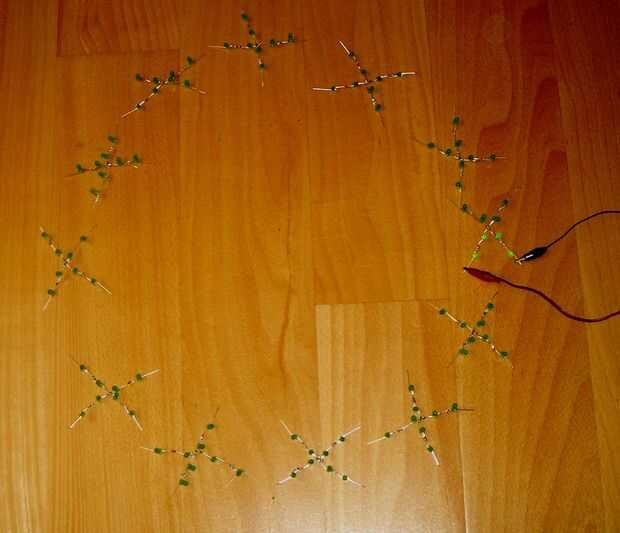 Después de usar la batería para probar cada X, recogerla y Oriente la X de modo que los cables negativos están en la parte superior y los cables positivos están en la parte inferior. Luego use los alicates de punta de aguja para doblar para arriba de la punta del cable negativo izquierda (arriba) en cada X.