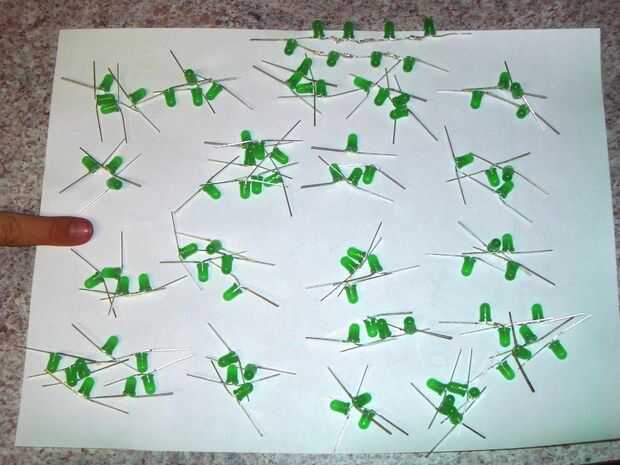 Aplanar las puntas en 96 de los LED verdes, para que se peguen hacia fuera en un ángulo de 90 grados del cuerpo del LED y a 180 grados uno del otro. Dóblelos metódicamente con el plus ida y menos el otro, por lo que tienen el mismo aspecto.