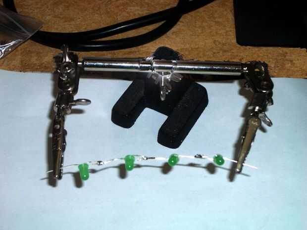 Después de cada filamento se prueba, asegúrese de que los cables están mecánicamente utilizando los alicates de punta de aguja, pero toman especial cuidado de no romper los cables de los LEDs. Si te gusta la soldadura, en este punto usted quiera simplemente sujetar la hebra para una tercera mano Cocodrilo clip herramienta y soldadura lejos, pero trence los conductores de por lo menos lo suficiente para hacer una conexión mecánica, como la soldadura no es bueno para ese trabajo.