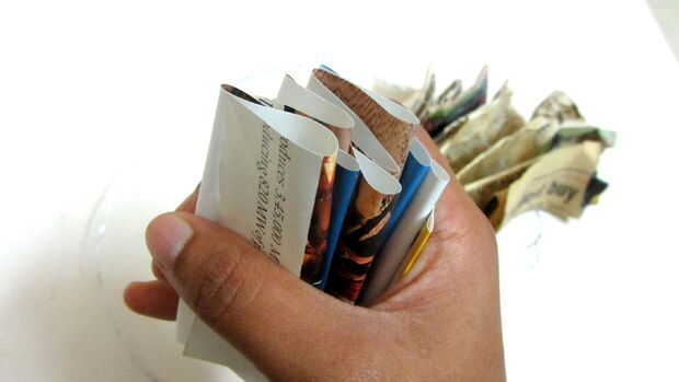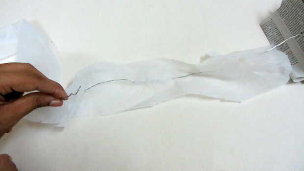Pase el cable por el orificio. Repita el tercer paso con muchas tiras de papel. Si usas tela plástica o un paño, perforar un agujero en el centro de una tira se reunieron, abrir la tela y recorren el alambre como cómo usted haría una puntada corriente.